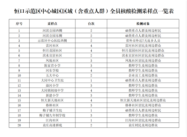 共設(shè)置20個(gè)采樣點(diǎn)、53個(gè)采樣臺(tái)(見附件),由相關(guān)責(zé)任單位統(tǒng)一負(fù)責(zé)采樣點(diǎn)設(shè)置、人員組織、秩序維護(hù),檢測(cè)對(duì)象按現(xiàn)場(chǎng)工作人員要求,有序到指定地點(diǎn)進(jìn)行采樣,避免人員聚集。