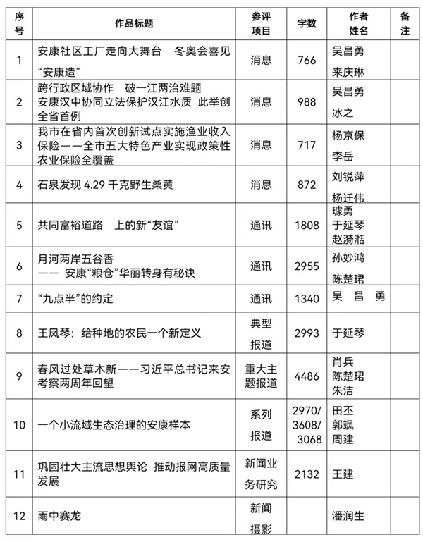 按照省記協(xié)要求,特將推薦參評(píng)2022年度陜西新聞獎(jiǎng)初評(píng)的作品予以公示。公示期為2023年2月13日至2月17日,在此期間內(nèi)如有異議請(qǐng)向新聞管理部反饋。報(bào)送作品如下:?
