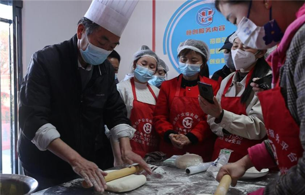 △學(xué)員們跟著師傅認(rèn)真學(xué)習(xí)面點技能