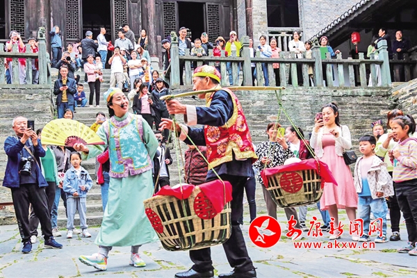 5月1日,旬陽(yáng)市蜀河古鎮(zhèn)展示傳統(tǒng)民俗文化引來(lái)游人喝彩。李春江 攝