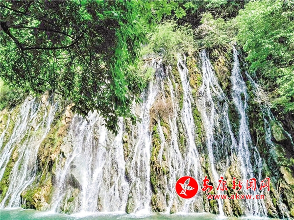 沿著木質(zhì)棧道前行,沒走多遠(yuǎn),耳中就傳來轟隆隆的水鳴聲,循聲望去,原來在大峽谷東南面的半山腰上有一掛巨大的瀑布。透過枝葉縫隙遙看瀑布的源頭,只見清清的泉水翻過一條石堰,從高高的崖壁口義無反顧地縱身飛躍而下,本是渾然一體的百米巨幅水簾,被凹凸不平的壁巖、樹枝、水草撕裂成形狀不一的一縷縷絹綢,千絲萬縷地交織著,撕扯著。細(xì)看,又猶如由萬千珍珠串起的珠簾,懸于半山腰間。瀑布四周彌漫著流云般的淡淡煙霞,初夏的陽光照耀著瀑布,折射出炫目的七彩光芒,形成一道道彩虹。粒粒珍珠流光溢彩、熠熠生輝。壁巖上嶙峋的怪石被水經(jīng)年累月地沖刷,早已失去了棱角,變得圓滑溫潤(rùn)。因?yàn)槌睗竦木売?,巖壁上鋪了一層厚厚的、碧綠的青苔,讓瀑布有了層次感,像極了妙手丹青繪制的巨幅山水壁畫,鮮活靈動(dòng)。游人紛紛拿出手機(jī),在此排隊(duì)拍照、攝影留念。因它位于峽谷門口,似是迎接各位游客,故得名“迎賓瀑”。想到前幾日,朋友圈有人曬出聞名古今的廬山瀑布,只剩下一縷細(xì)細(xì)的溪流,從上面無力地流瀉下來,似是隨時(shí)都有中斷的可能,哪里還有“飛流直下三千尺,疑是銀河落九天”的氣勢(shì)時(shí),不由得對(duì)眼前的這掛瀑布更加喜愛。