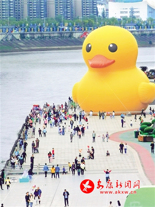 國慶期間,安康城區(qū)漢江公園一只大大的“黃鴨”成為了市民新的打卡地。吳定國 攝