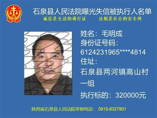 為了進(jìn)一步加大執(zhí)行力度,保障勝訴當(dāng)事人的合法權(quán)益,推進(jìn)社會(huì)誠(chéng)信體系建設(shè),依照《中華人民共和國(guó)民事訴訟法》《最高人民法院關(guān)于公布失信被執(zhí)行人名單信息的若干規(guī)定》等法律、司法解釋的有關(guān)規(guī)定,現(xiàn)對(duì)一批已進(jìn)入執(zhí)行程序,且尚未全部履行義務(wù)的被執(zhí)行人進(jìn)行媒體曝光,歡迎廣大群眾支持石泉縣人民法院的工作,向我院提供被執(zhí)行人的財(cái)產(chǎn)線索,使生效法律文書能夠得到切實(shí)執(zhí)行,讓人民群眾切實(shí)感受到公平正義就在身邊。