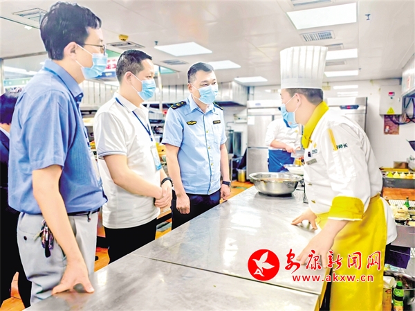 “五一”假日將至,漢濱區(qū)紀(jì)委監(jiān)委會(huì)同市場(chǎng)監(jiān)督管理部門對(duì)中心城區(qū)酒店餐飲服務(wù)場(chǎng)所開(kāi)展監(jiān)督檢查。圖為檢查組在某酒店后廚了解情況。鄭時(shí)根 攝