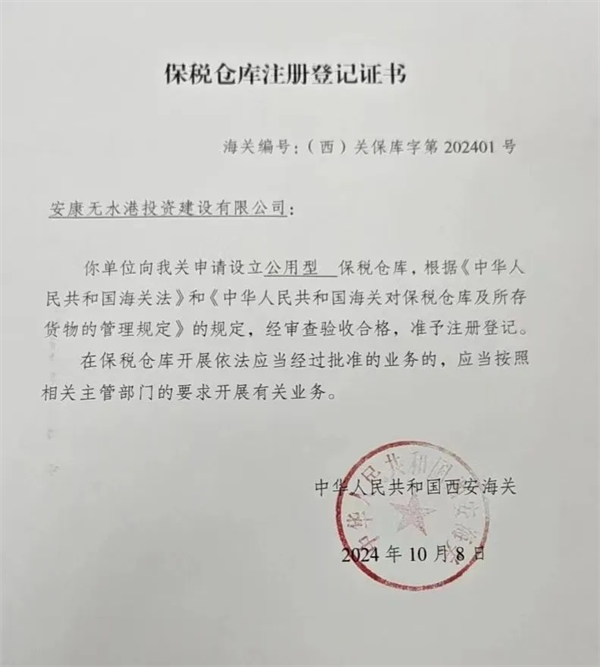 10月8日,由恒口示范區(qū)申請(qǐng)?jiān)O(shè)立的“公用型保稅倉(cāng)庫(kù)”正式通過(guò)海關(guān)審查驗(yàn)收,成功獲得由西安海關(guān)頒發(fā)的《保稅倉(cāng)庫(kù)注冊(cè)登記證書(shū)》,標(biāo)志著該保稅倉(cāng)已具備正式運(yùn)營(yíng)資質(zhì)和能力,可正式對(duì)外開(kāi)展實(shí)際業(yè)務(wù)。