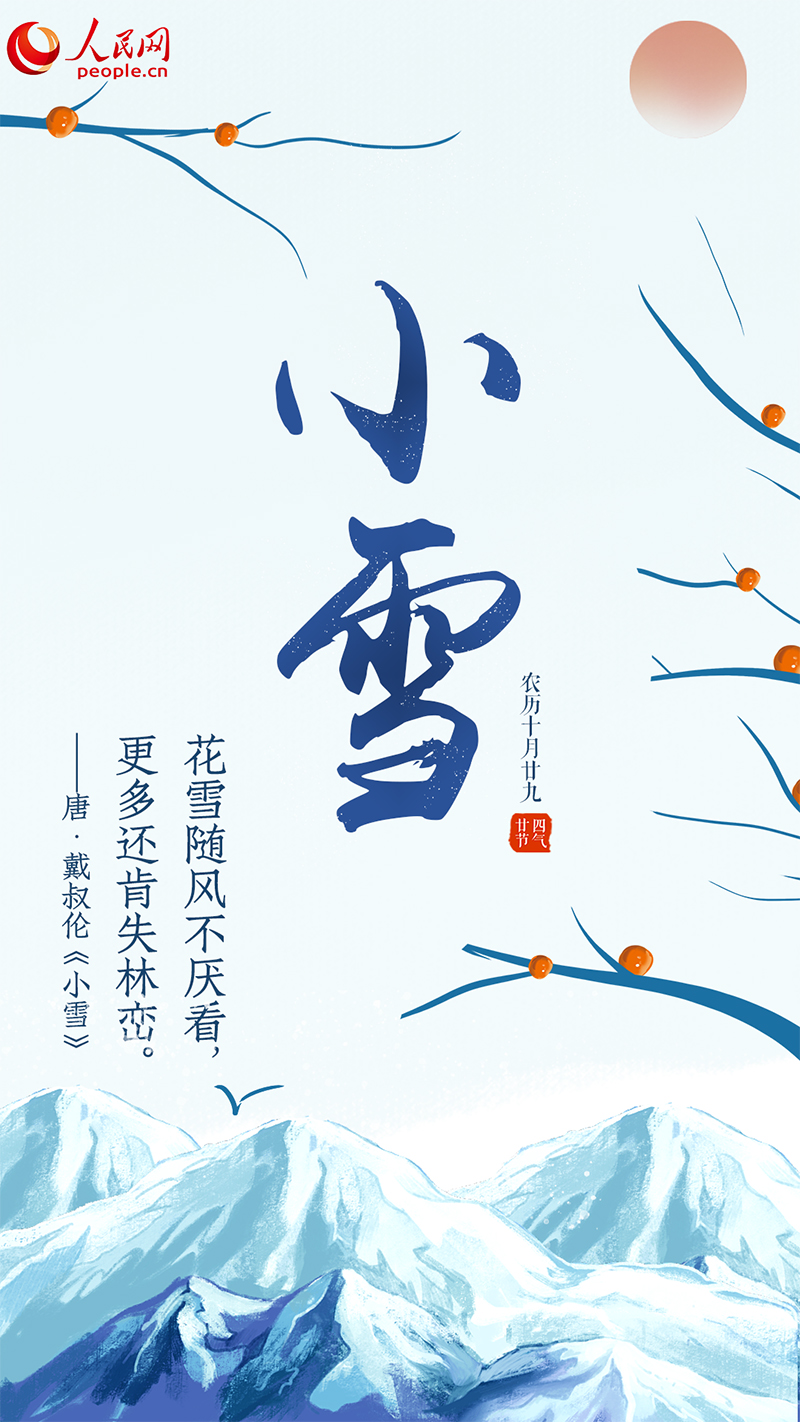 小雪之時,雖寒氣來襲,冷風(fēng)直撲,但也能從中找到一份獨特的浪漫?!盎ㄑ╇S風(fēng)不厭看,更多還肯失林巒”,唐代詩人戴叔倫看著窗前飄揚的花雪,洋洋灑灑飛到山林之中,甚是好看;“滿城樓觀玉闌干,小雪晴時不共寒”,宋代詩人黃庭堅看到下雪頓覺開心,天晴后也沒那么寒冷;“小雪未成寒,平湖好放船”,宋代詩人韓維發(fā)現(xiàn)小雪雖至,湖面還未結(jié)冰,尚可乘船游湖、觀賞美景。