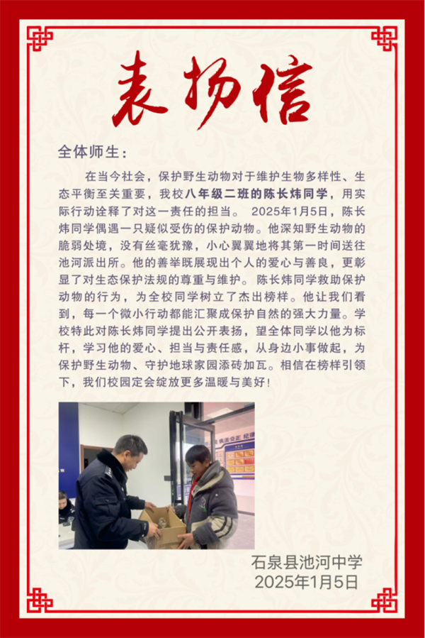 陳長(zhǎng)煒的暖心事跡傳到學(xué)校后,學(xué)校發(fā)布了表揚(yáng)信,公開表揚(yáng)陳長(zhǎng)煒同學(xué)的愛心善舉和保護(hù)野生動(dòng)物的暖心行為。號(hào)召全體學(xué)生要學(xué)習(xí)陳長(zhǎng)煒的愛心、責(zé)任和擔(dān)當(dāng),從小事做起,從自身做起,保護(hù)野生動(dòng)植物,為保護(hù)地球家園、尊重生態(tài)文明的多樣性貢獻(xiàn)力量。?