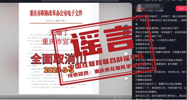真相:近日,有網(wǎng)民在互聯(lián)網(wǎng)平臺發(fā)布消息稱“重慶市宣布,申請評審的要求取消了很多條條框框,職稱申請不看前置職稱,全日制本科十年直接認(rèn)定副高,不需要中級職稱”,引發(fā)關(guān)注。經(jīng)核實,網(wǎng)傳信息系謠言。職稱評審均需逐級晉升,取得上一級職稱并滿足相應(yīng)學(xué)歷資歷條件后方可晉升高一級職稱。目前重慶市除特殊人才、博士后等3個針對特定對象的職稱申報綠色通道外,正常申報通道均需逐級晉升。網(wǎng)傳文件是網(wǎng)民通過P圖軟件編輯而成,試圖吸引不明真相的群眾咨詢,借機(jī)推銷職稱代辦服務(wù),收取高額費(fèi)用。目前,謠言線索已轉(zhuǎn)交公安機(jī)關(guān)進(jìn)一步調(diào)查處置。(來源:“重慶辟謠”微信公眾號)