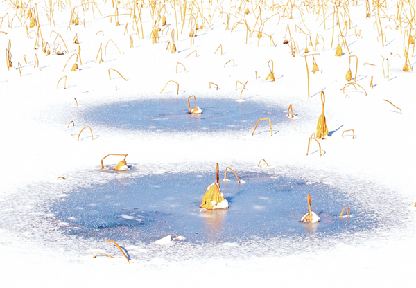 我的攝影創(chuàng)作圍繞生命的痕跡、時間的隱喻兩個主題。在《嘉實擷芳·野圃瑤音》中,菜園的微觀生態(tài)被賦予交響樂般的節(jié)奏——葫蘆藤的螺旋曲線是生命的律動,西紅柿根莖的垂直排列是生長的秩序,蚜蟲蝕痕的細(xì)節(jié)則暗喻生態(tài)的共生與抗?fàn)?。而在《澄漪棹影·沙月溯光》里,榮成海岸的冬夏對比成為時間的隱喻,結(jié)冰湖面上的凋敗蓮蓬是流逝凝固的時光,夏日海邊的金色水洼則是流動的永恒。我癡迷于捕捉這種矛盾與共生——就像用冷暖色調(diào)碰撞出畫面的張力,也用虛實構(gòu)圖處理每一張照片,期待每一張照片是個性鮮明,讓人耳目一新。