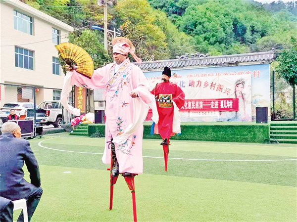 在五峰村,村支部書(shū)記羅仁春告訴記者,2023年村委會(huì)牽頭成立了五峰村文化民俗文藝協(xié)會(huì),陸續(xù)加入的48名會(huì)員涵蓋老中青三代,既有傳承高蹺絕技的老人,也有主動(dòng)學(xué)習(xí)弦子腔的年青一代。今年32歲的村民小梅加入?yún)f(xié)會(huì)后,一改往日下班后悶在家中的狀態(tài),每天下午吃完飯都會(huì)下樓和新認(rèn)識(shí)的姐妹載歌載舞,很快就成為舞蹈隊(duì)的主力?!耙郧安恢牢覀兇迳线€有文藝協(xié)會(huì),自從村上干部告訴我后,我就趕緊加入了這個(gè)小團(tuán)體,既鍛煉了身體,又愉悅了心情,生活幸福感越來(lái)越強(qiáng)烈?!鄙碇璧阜男∶飞碜随鼓?,水袖飛揚(yáng)間,明媚的笑容如花一樣燦爛。