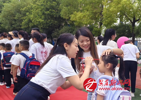 走紅毯環(huán)節(jié)將氛圍推向高潮。班主任帶領(lǐng)新生與家長手牽手緩緩前行,周圍的歡呼聲此起彼伏,孩子們?cè)谶@份熱鬧中,真切感受到“成為小學(xué)生”的榮譽(yù)感?!懊6Y”環(huán)節(jié)巧思滿滿,8種寓意吉祥的物品整齊擺放,孩子們懷著好奇伸手觸摸,在指尖的互動(dòng)中,收下滿含期許的祝福。