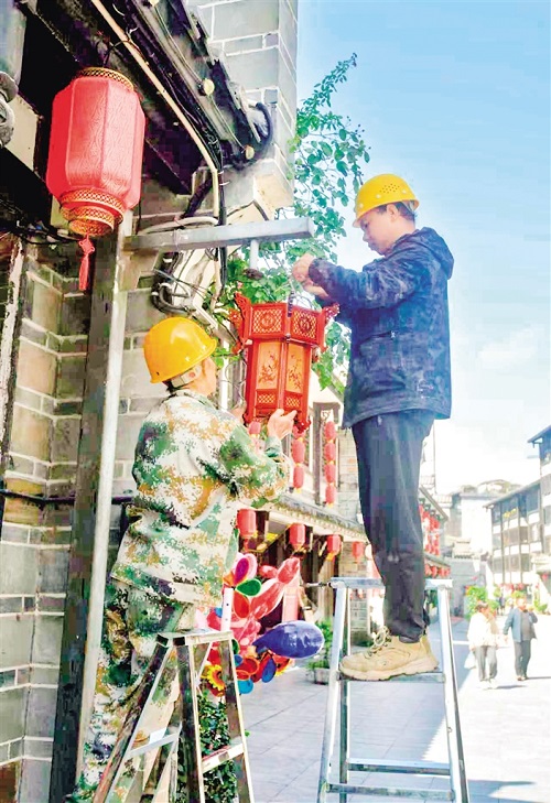 9月24日,石泉縣積極籌備國慶黃金周旅游服務(wù)保障工作。圖為石泉縣漢江古城景區(qū),工作人員正在更換景觀燈。?譚文昌 攝