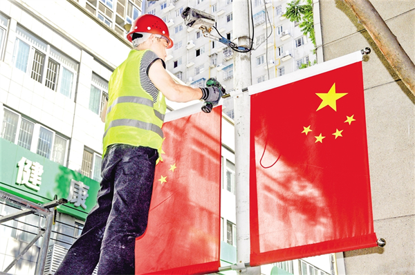 9月25日,紫陽縣城區(qū)橋溝路的大道上,工人正在懸掛國旗。?彭召伍 攝
