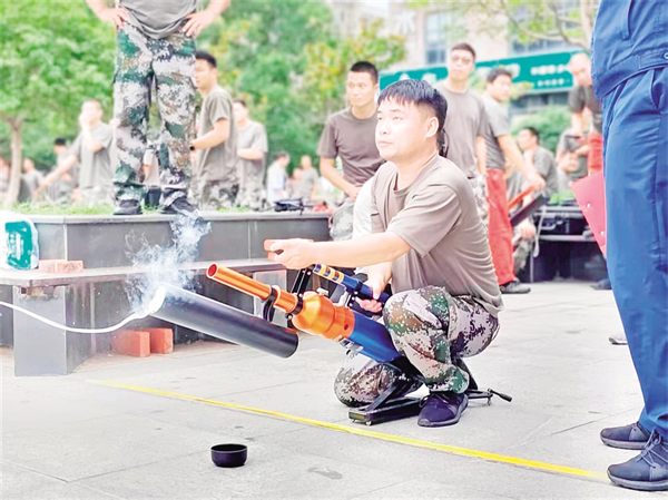 “應(yīng)急通信與拋投設(shè)備”科目賽場(chǎng),科技含量高。無(wú)人機(jī)騰空而起,飛向模擬的7樓窗口查看電話號(hào)碼,衛(wèi)星電話迅速撥通,接收考官指令;拋投器精準(zhǔn)發(fā)射,命中目標(biāo)區(qū)域。