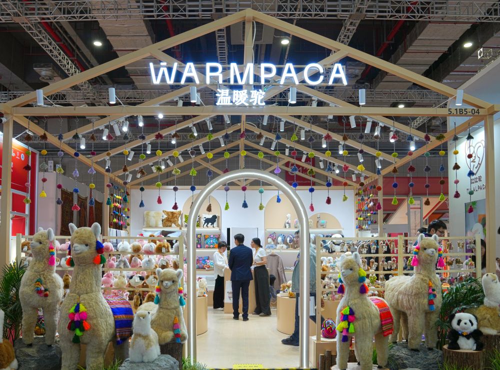 2025年11月5日在第八屆進博會消費品展區(qū)拍攝的“溫暖駝”展臺。從秘魯阿雷基帕的小店,到進博會的展臺,再到全球消費者手中,進博會為“溫暖駝”帶來了巨大的發(fā)展機遇。本屆進博會,“溫暖駝”展位面積已從2018年首屆進博會的9平方米拓展至54平方米,并在上海、廈門等地開設(shè)6家門店。源自進博會的“溫暖駝”訂單不僅助力秘魯200多個家庭脫貧,還倒逼一場“品質(zhì)革命”,讓羊駝玩偶制作對標世界標準。