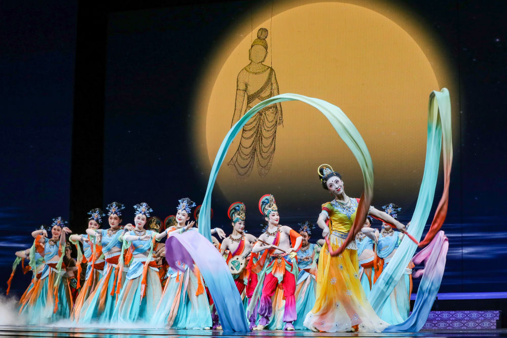 ??2025年9月22日,在敦煌舉辦的“相約敦煌”國際文化交流演出活動上,甘肅省演藝集團(tuán)的演員展演《樂動敦煌》選段?!稑穭佣鼗汀方柚鷮δ呖弑诋嫛⒉亟?jīng)洞古籍的解讀梳理,活化敦煌古樂器、古樂譜研發(fā)成果,通過全息投影等手段,結(jié)合專業(yè)演員的表演,將莫高窟壁畫中的樂舞盛景生動再現(xiàn),讓觀眾沉浸式感悟傳承千年的敦煌樂舞文化魅力。