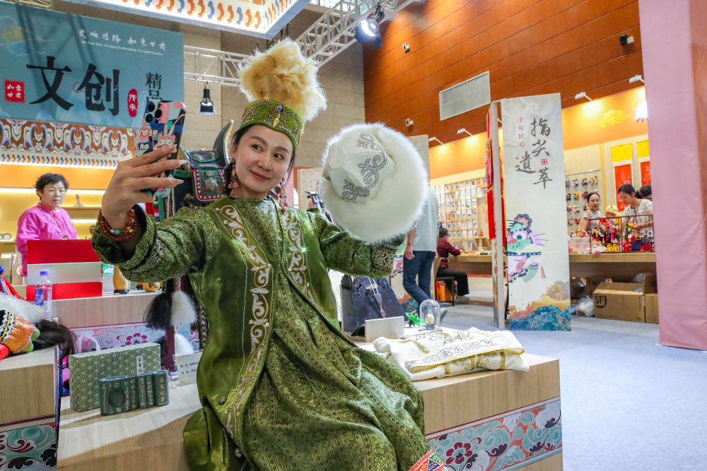 ??2025年9月22日,游客在敦煌文博會上身穿民族服飾自拍。9月20日至22日,第八屆絲綢之路(敦煌)國際文化博覽會在敦煌市舉行。敦煌研究院“典范”“高地”建設(shè)成果展、甘肅文旅非遺文創(chuàng)展、敦煌·絲路雕塑展等多項展覽同步亮相,集中展現(xiàn)了敦煌文化遺產(chǎn)保護(hù)、研究、弘揚的最新成果以及共建“一帶一路”國家的文化藝術(shù)、非遺文創(chuàng)、風(fēng)土人情等精彩內(nèi)容。