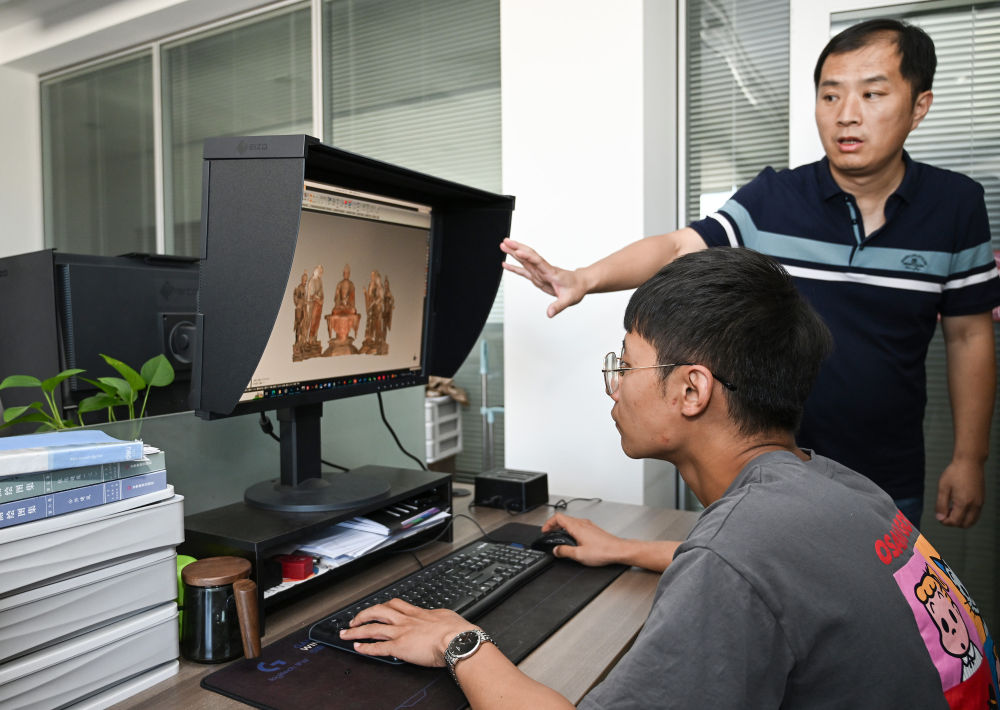 ??2023年8月3日,敦煌研究院文物數(shù)字化研究所的工作人員在展示莫高窟彩塑三維重建的成果。近年來,敦煌研究院持續(xù)加大文物保護(hù)基礎(chǔ)研究和應(yīng)用研究,不斷加強(qiáng)文物科技保護(hù)力度,提升科研平臺建設(shè),為文物保護(hù)和文化遺產(chǎn)事業(yè)發(fā)展奠定良好基礎(chǔ)。