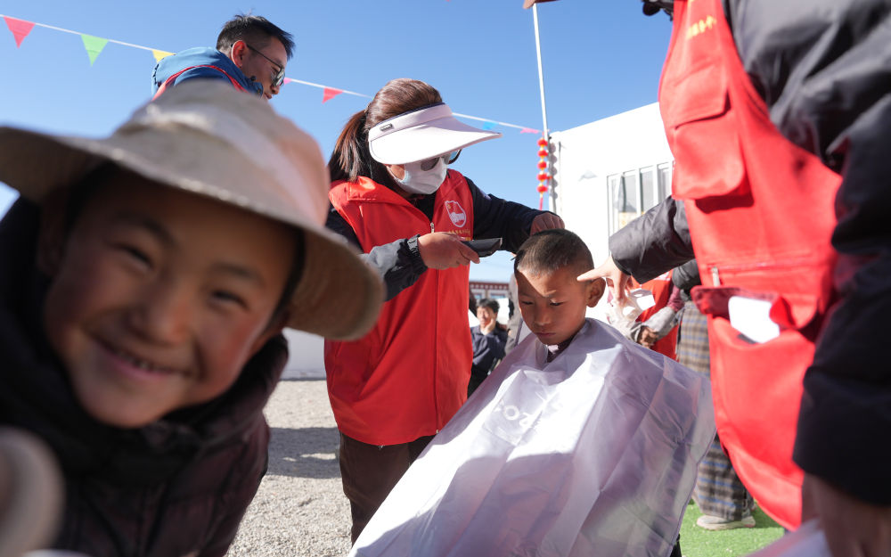 ??2025年1月26日,志愿者在西藏拉孜縣吉如村安置點(diǎn)為孩子們理發(fā)。西藏定日縣6.8級地震發(fā)生后,志愿者們迅速參與救援搜救、協(xié)助搭建帳篷、搬運(yùn)賑濟(jì)物資、協(xié)調(diào)村民所需。數(shù)百名大學(xué)生組成志愿者服務(wù)隊(duì),白天為安置點(diǎn)的孩子們輔導(dǎo)作業(yè)、陪孩子們運(yùn)動;晚上組成巡邏隊(duì),守護(hù)安置點(diǎn)的安寧。