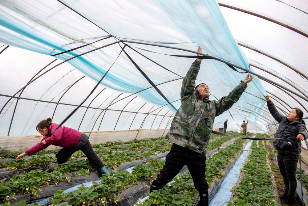 ??2023年12月15日,志愿者在浙江湖州長興縣水口鄉(xiāng)幫助農(nóng)戶加蓋大棚保溫膜。為應(yīng)對強(qiáng)雨雪天氣,志愿者們幫助農(nóng)戶清理大棚上的積雪,加裝綁棚繩,棚內(nèi)增設(shè)立柱,提高大棚抗風(fēng)雪能力,確保農(nóng)產(chǎn)品正常生產(chǎn)供應(yīng)。
