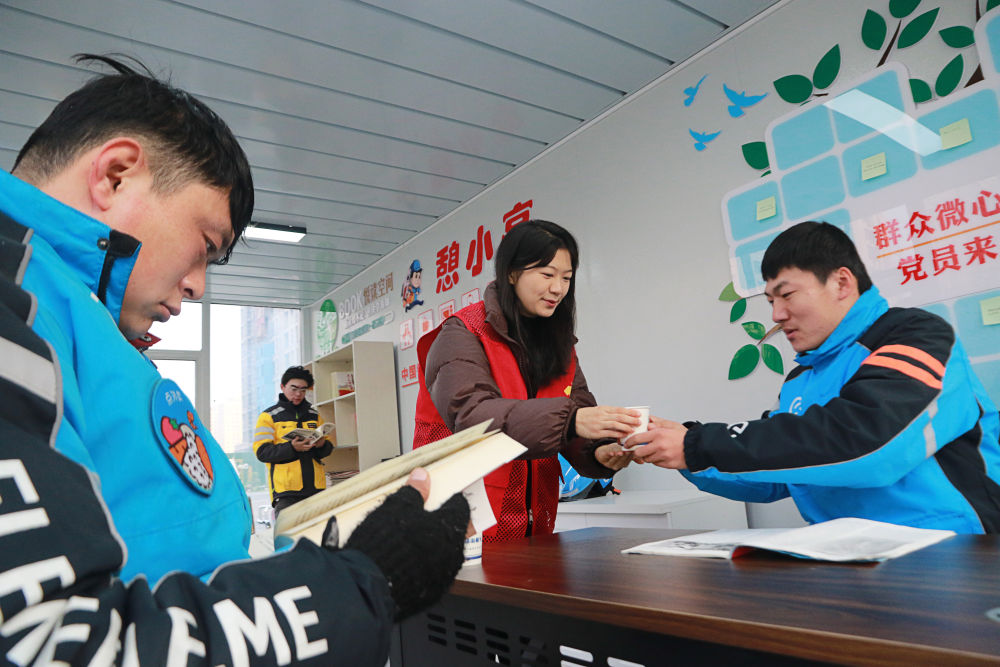 ??2023年12月27日,志愿者在山東省高密市密水街道“憩小亭”服務(wù)站為外賣騎手送上熱水。入冬以來,山東省高密市密水街道推進(jìn)“憩小亭”暖心服務(wù)站建設(shè),為外賣騎手、快遞小哥、網(wǎng)約車司機(jī)、環(huán)衛(wèi)工人等戶外勞動者提供飲水、無線上網(wǎng)、食物加熱等多項(xiàng)服務(wù),讓他們感受到冬日里的溫暖。