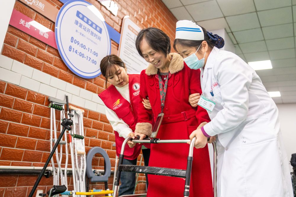 ??2025年11月6日,志愿者及醫(yī)務(wù)人員在湖南長沙望城區(qū)高塘嶺街道中南社區(qū)幫助行動不便的居民使用康復(fù)器具。