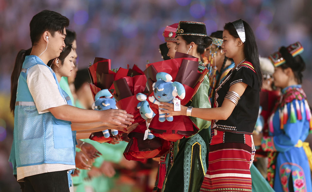 ??2024年11月30日,五十六個民族代表在海南三亞舉行的第十二屆全國少數(shù)民族傳統(tǒng)體育運(yùn)動會閉幕式上為志愿者獻(xiàn)花。運(yùn)動會期間,數(shù)千名志愿者“小鹿鹿”奔赴十余個競賽場館、二十多家接待酒店、媒體中心、機(jī)場車站等地,為來自全國各地的運(yùn)動員、技術(shù)官員、工作人員和觀眾提供禮賓接待、交通引導(dǎo)、安全保衛(wèi)等志愿服務(wù)。