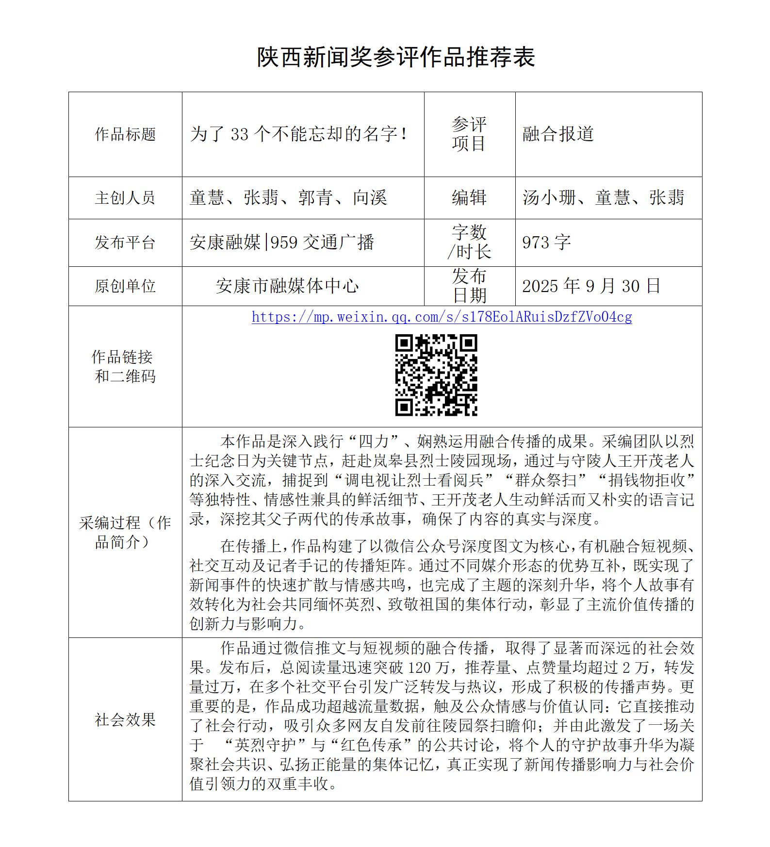 根據(jù)《陜西新聞獎、陜西省優(yōu)秀新聞工作者評選辦法》和《關(guān)于開展2025年度陜西新聞獎融合報道、應(yīng)用創(chuàng)新和新媒體新聞專欄作品推優(yōu)工作的通知》要求,經(jīng)個人申報、部門推薦和中心編委會嚴(yán)格篩選,對以下3件2025年度陜西新聞獎融合報道、應(yīng)用創(chuàng)新、新媒體新聞專欄參評作品進行公示。(作品推薦表附后)