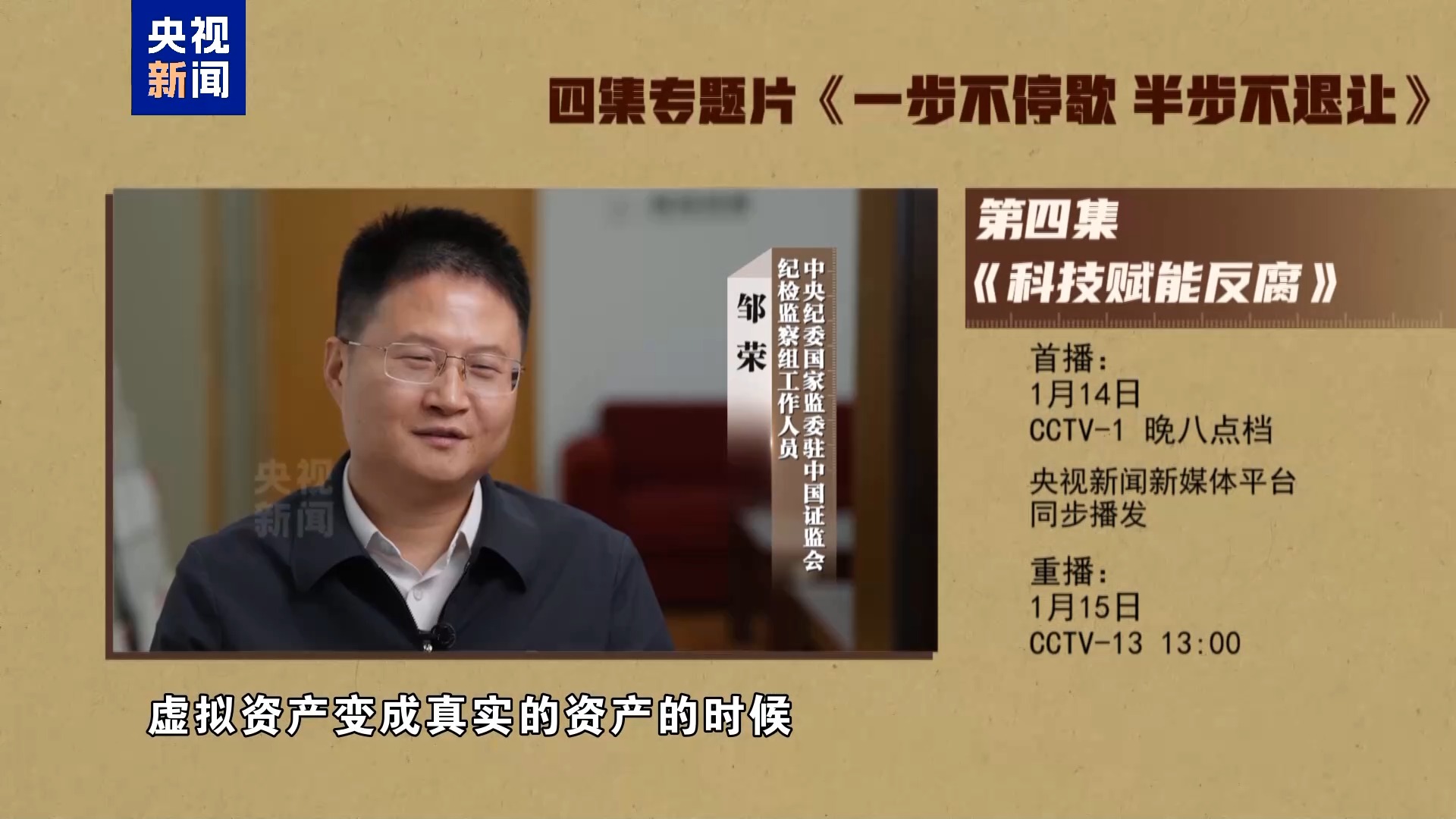 電視專題片《一步不停歇 半步不退讓》第四集《科技賦能反腐》,講述紀檢監(jiān)察機關豐富防治新型腐敗和隱性腐敗有效辦法,以信息化賦能正風反腐,充分運用科技手段精準發(fā)現(xiàn)不正之風和腐敗問題線索、迅速有效突破案件,著力提升智慧反腐、科技反腐水平。總臺央視綜合頻道1月14日晚8點檔播出,央視新聞新媒體平臺同步播發(fā)。