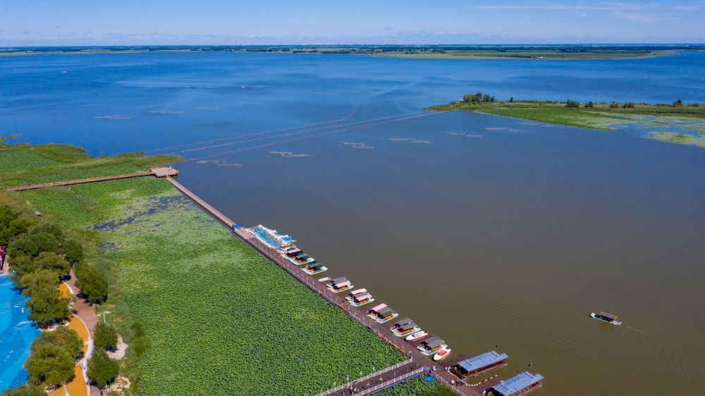 ??2020年7月20日拍攝的查干湖濕地。查干湖通過一系列工程性、生物性和管理性措施,不斷擴(kuò)大濕地面積,維護(hù)濕地生態(tài)平衡。截至2025年2月,查干湖實施濕地保護(hù)與恢復(fù)等項目24個,通過河道治理、引水灌溉、生態(tài)修復(fù)等工程,調(diào)配利用洪水資源和灌溉回歸水,實現(xiàn)“松花江—查干湖—嫩江”水體連通和動態(tài)循環(huán)。