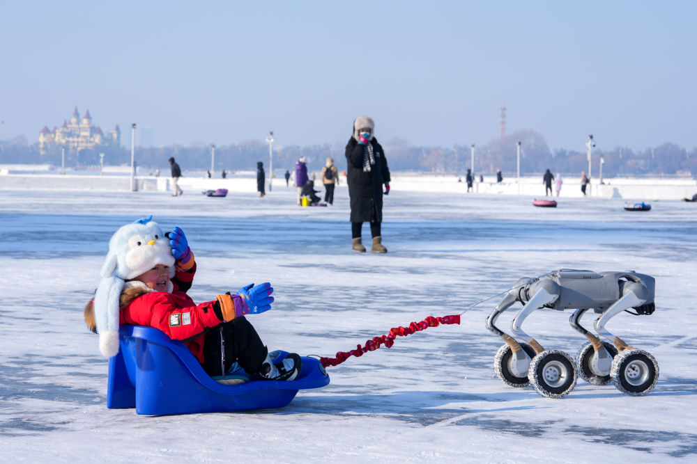 ?? 1月11日,小朋友在松花江哈爾濱段江面上體驗(yàn)機(jī)器狗拉爬犁。新華社記者 王建威 攝