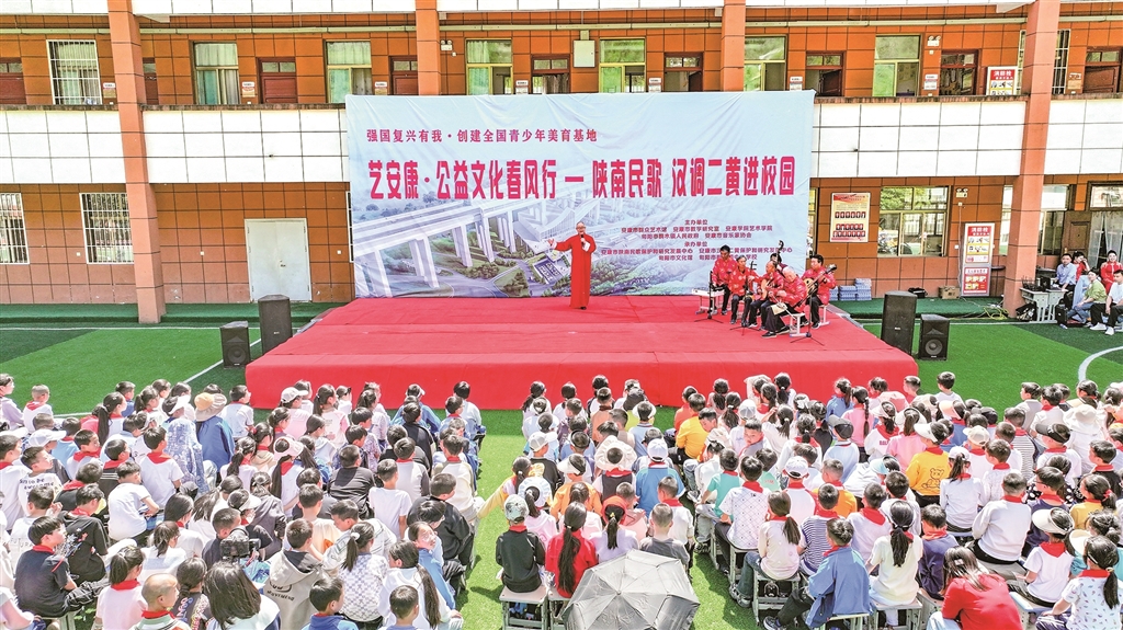 展演現(xiàn)場(chǎng),紫陽小學(xué)學(xué)生帶來的民歌聯(lián)唱《童聲唱紫陽》贏得滿堂喝彩。孩子們用清亮的嗓音演繹《開山歌》《三月三上茶山》《螃蟹歌》等經(jīng)典陜南民歌,悠揚(yáng)婉轉(zhuǎn)的旋律中透著童真童趣,將地域文化的獨(dú)特韻味展現(xiàn)得淋漓盡致。“這首歌是奶奶教我唱的,現(xiàn)在我在學(xué)校社團(tuán)里學(xué)會(huì)了更多唱法?!敝鞒獙W(xué)生鄧可唯說,通過美育課程,她不僅學(xué)會(huì)了唱歌,還了解了民歌背后的民俗故事。