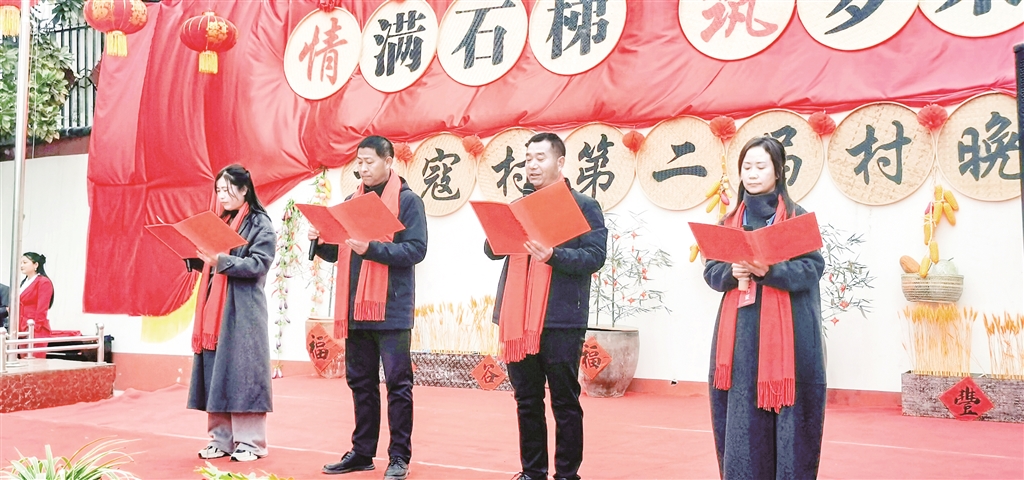 臺(tái)上傾情演繹,臺(tái)下如癡如醉。觀眾紛紛舉著手機(jī),用鏡頭記錄精彩瞬間。從外地返鄉(xiāng)過年的村民小寇對(duì)節(jié)目《雙村之歌》贊不絕口:“咱村的‘村晚’一點(diǎn)不輸電視上的晚會(huì),有特色、有味道!”
