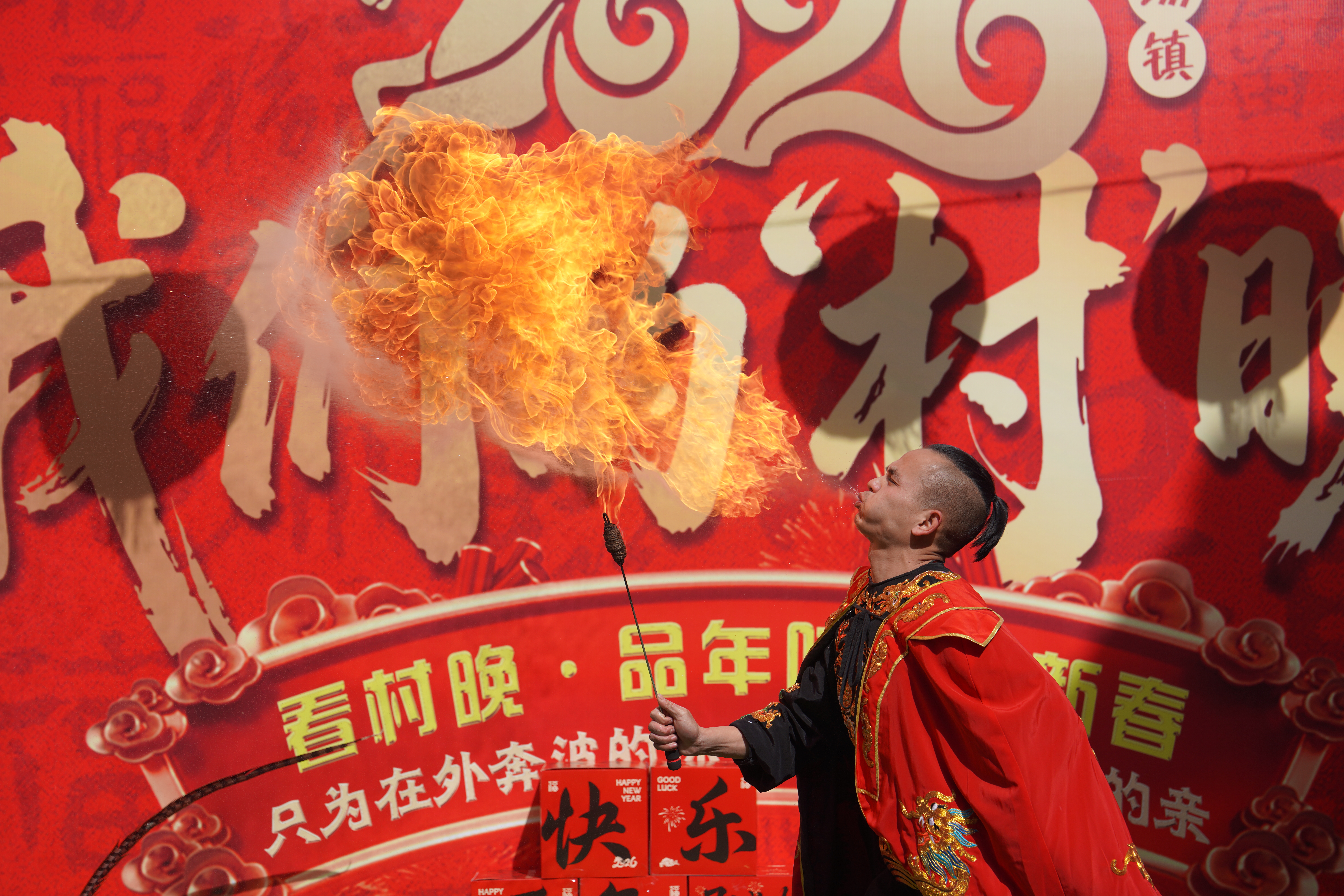 △ 2月2日,演職人員在新場鎮(zhèn)“村晚”舞臺上進(jìn)行特技表演。