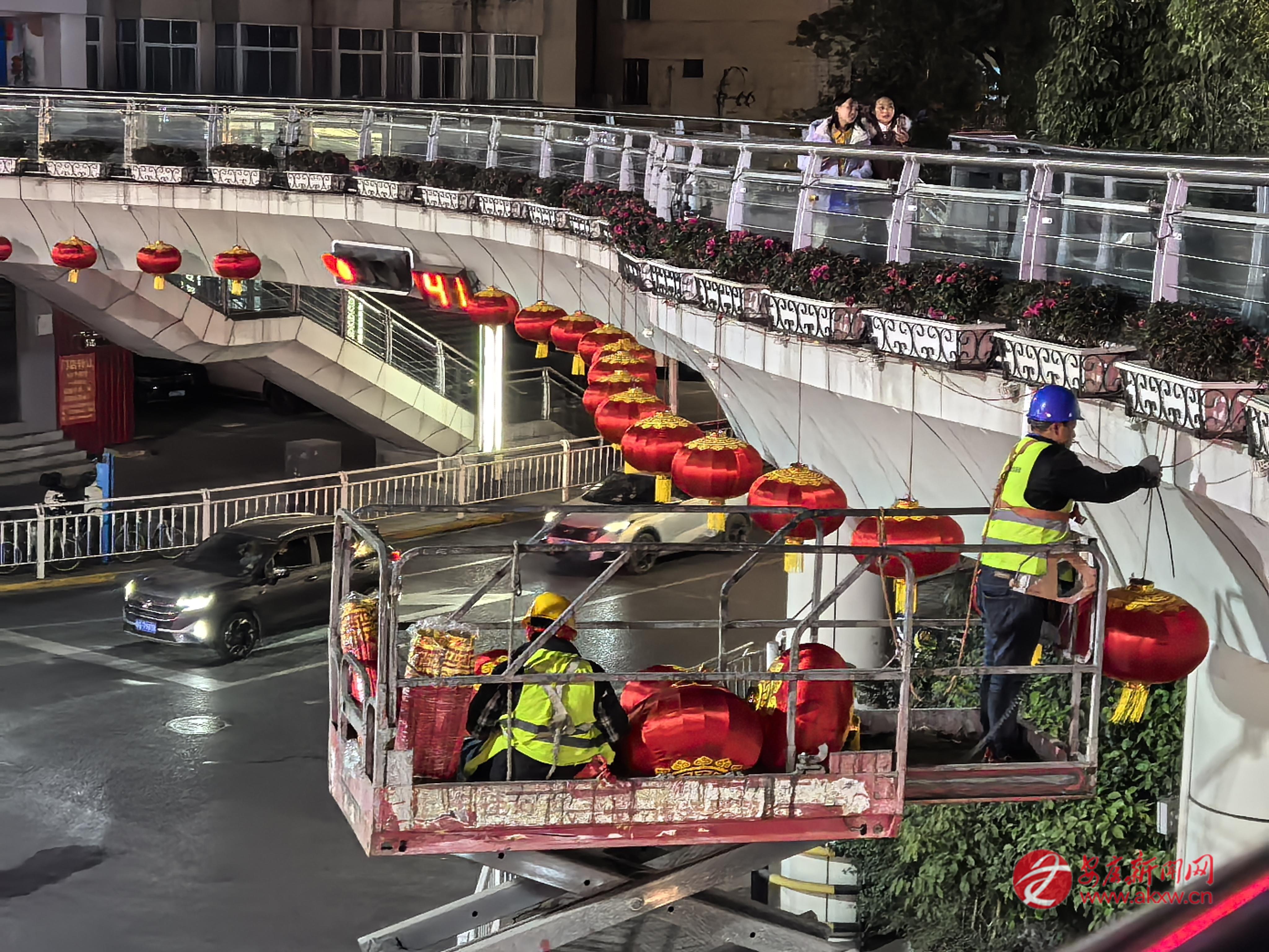 工人在安康城區(qū)大橋路、巴山路十字天橋安裝景觀燈,營造節(jié)日氛圍。 記者 艾蓓 攝