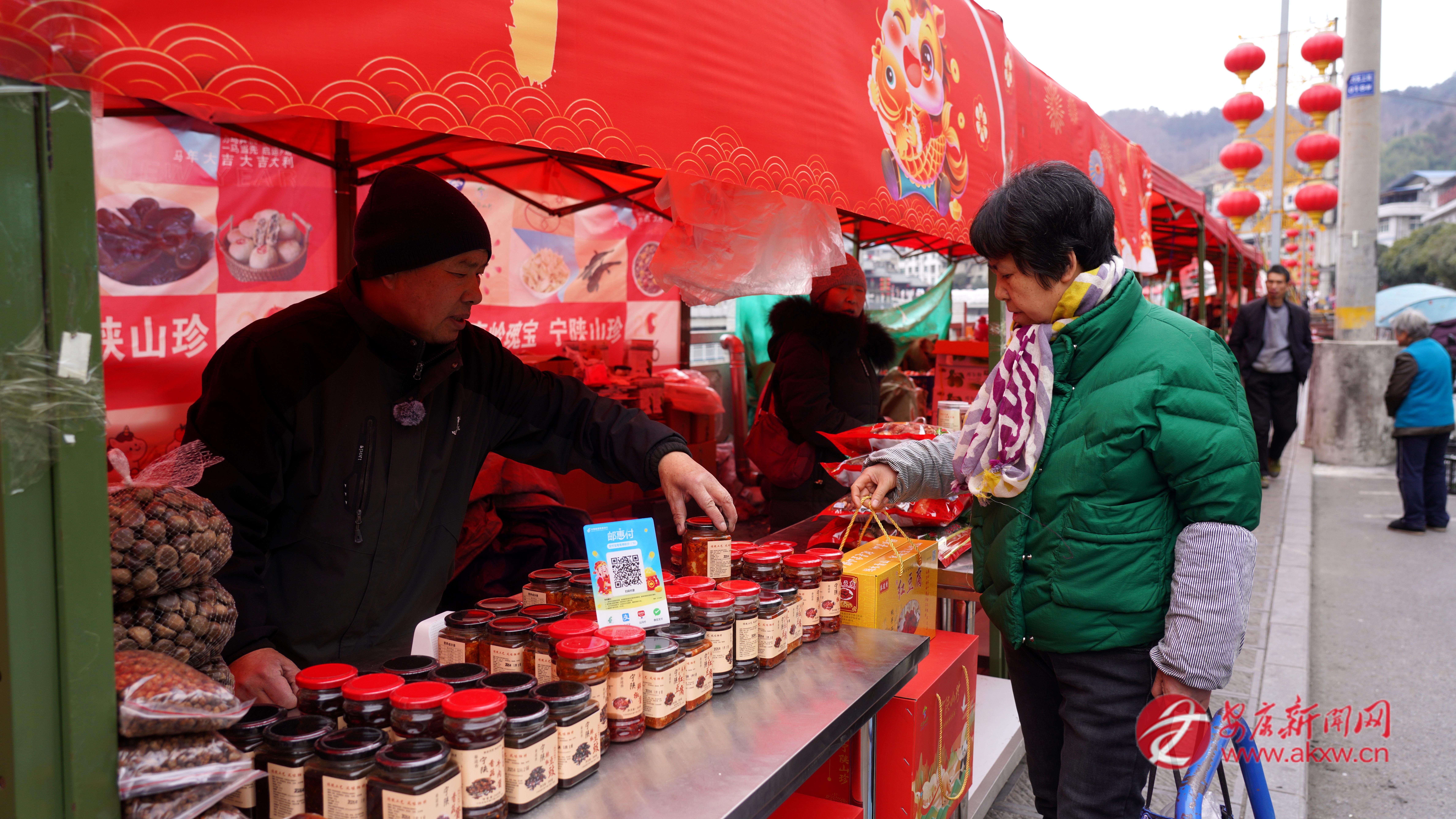 在寧陜縣城河堤東街的“年貨大集”,134個攤位整齊排布,本地臘肉油亮誘人、野生香菇厚實飽滿、土蜂蜜晶瑩剔透、木耳如墨玉般堆疊;新衣、玩具、春聯(lián)、中國結(jié)琳瑯滿目,一片喜慶祥和的景象。
