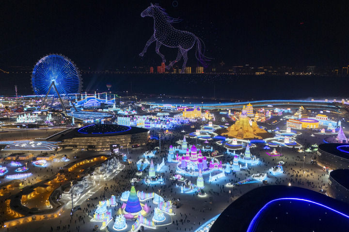 這是2026年1月5日拍攝的哈爾濱冰雪大世界園區(qū)的無(wú)人機(jī)表演(無(wú)人機(jī)照片)。新華社記者 張濤 攝