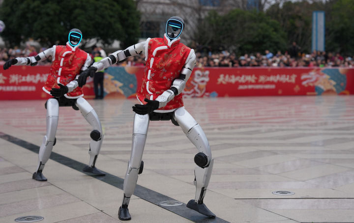2026年2月28日,宇樹(shù)科技人形機(jī)器人在浙江省桐廬縣中心廣場(chǎng)表演舞蹈。新華社記者 黃宗治 攝