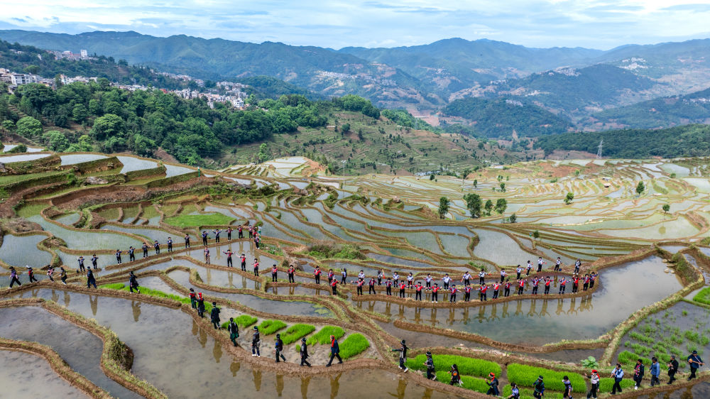2025年5月2日,在云南省紅河縣甲寅村“開秧門”儀式上,村民身著民族服飾,沿著田埂踏歌而行(無(wú)人機(jī)照片)。新華社記者 胡超 攝