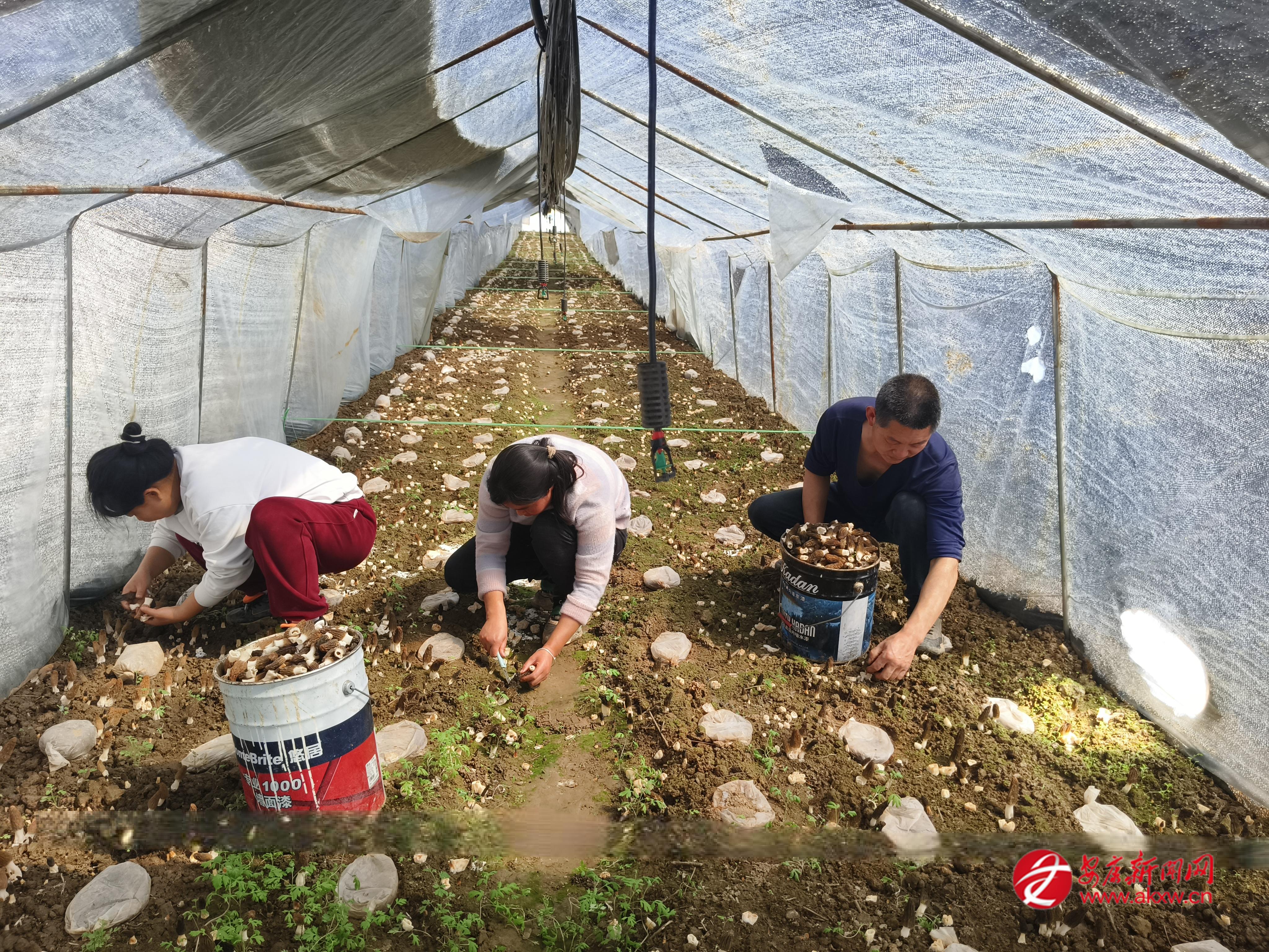 江口鎮(zhèn)欣蕊羊肚菌農(nóng)業(yè)技術(shù)開(kāi)發(fā)家庭農(nóng)場(chǎng)內(nèi),工人正在采摘羊肚菌。