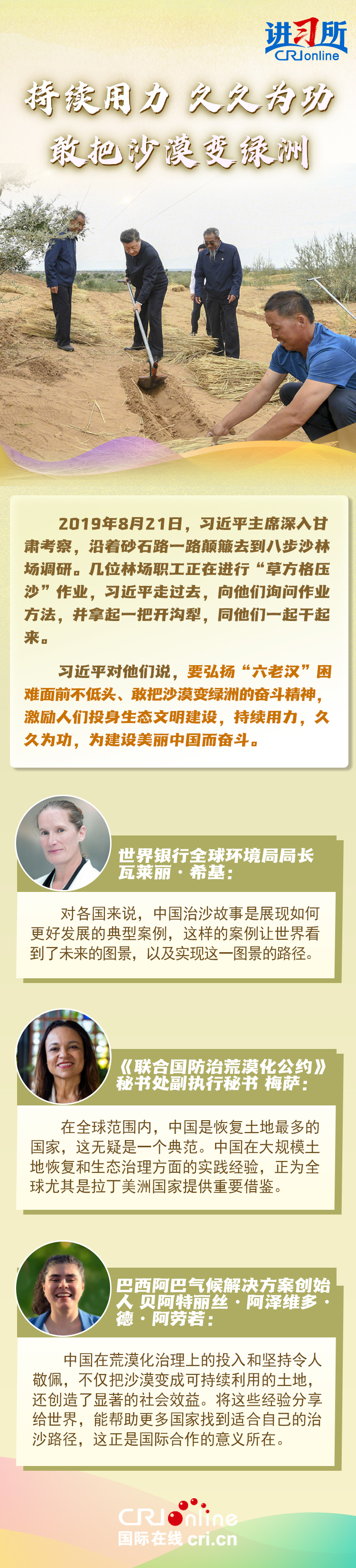 中共十八大以來,中國森林面積和蓄積量持續(xù)“雙增長”,荒漠化和沙化土地面積持續(xù)“雙縮減”,是全球增綠最多最快的國家。習(xí)近平主席始終身體力行:在北京連續(xù)14年參加首都義務(wù)植樹活動,在甘肅與林場職工一起進行“草方格壓沙”作業(yè),在陜西親自“驗收”秦嶺生態(tài)保護……