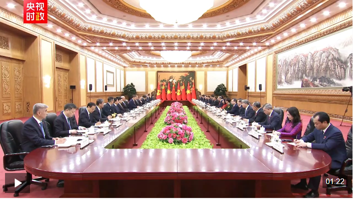 習(xí)近平指出,你當(dāng)選越南國家主席后第一時間到訪中國,體現(xiàn)了你對發(fā)展中越關(guān)系的高度重視。無論國際形勢如何變化,中方始終將越南作為周邊外交優(yōu)先方向,愿同越方秉持初心、賡續(xù)友誼,團(tuán)結(jié)協(xié)作、相互支持,高質(zhì)量推進(jìn)全面戰(zhàn)略合作,加快構(gòu)建更高水平具有戰(zhàn)略意義的中越命運共同體。