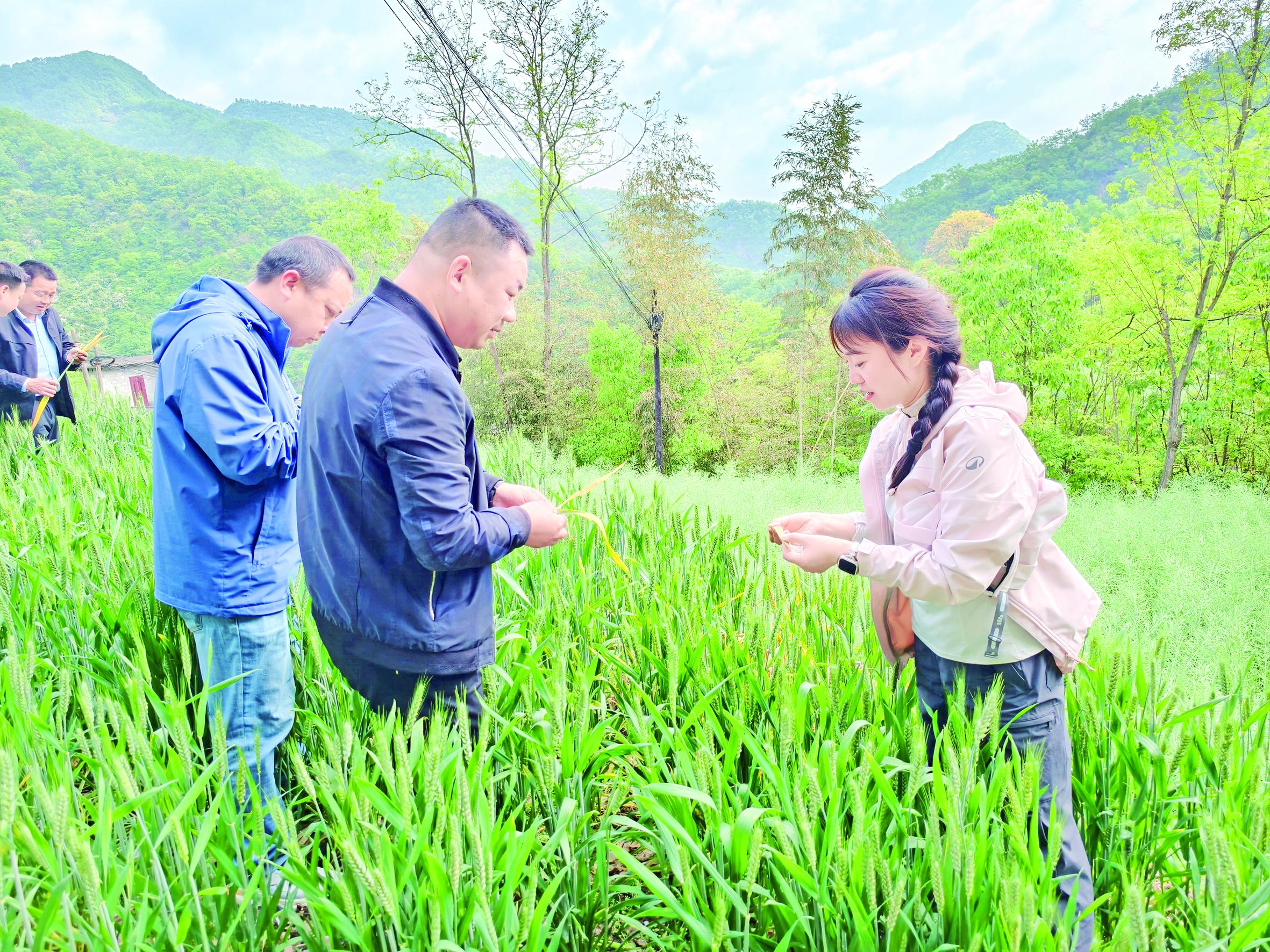 農(nóng)機(jī)專家在麥地指導(dǎo)小麥病蟲害防控工作。