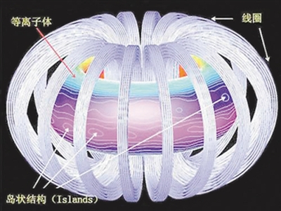 中國超導(dǎo)托卡馬克實驗裝置(即Experimental Advanced Superconducting Tokamak,縮寫為EAST,也被稱為“東方超環(huán)”)是在真空室內(nèi)加入少量氫的同位素氘或氚,通過類似變壓器的原理使其產(chǎn)生等離子體,然后提高其密度、溫度使其發(fā)生聚變反應(yīng),反應(yīng)過程中會產(chǎn)生巨大能量。其原理在本質(zhì)上與太陽核聚變相似,因而,“東方超環(huán)”也被譽為中國的“人造太陽”。