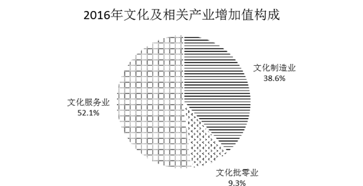 按行業(yè)分,2016年文化制造業(yè)增加值為11889億元,比上年增長7.6%,占文化及相關(guān)產(chǎn)業(yè)增加值的比重為38.6%;文化批發(fā)零售業(yè)增加值為2872億元,增長13.0%,占9.3%;文化服務(wù)業(yè)增加值為16024億元,增長17.5%,占52.1%。