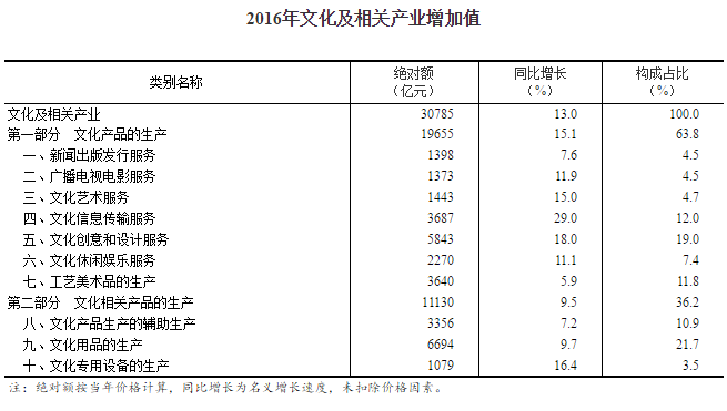 數(shù)據(jù)顯示,根據(jù)《文化及相關(guān)產(chǎn)業(yè)分類(2012)》和《文化及相關(guān)產(chǎn)業(yè)增加值核算方法》的規(guī)定和要求,經(jīng)核算,2016年全國文化及相關(guān)產(chǎn)業(yè)增加值為30785億元,比上年增長13.0%(未扣除價格因素,下同),比同期GDP名義增速高4.4個百分點;占GDP的比重為4.14%,比上年提高0.17個百分點。2016年文化及相關(guān)產(chǎn)業(yè)保持平穩(wěn)快速增長,比重穩(wěn)步上升,對促進(jìn)經(jīng)濟(jì)轉(zhuǎn)型升級、平穩(wěn)健康可持續(xù)發(fā)展發(fā)揮了重要作用。