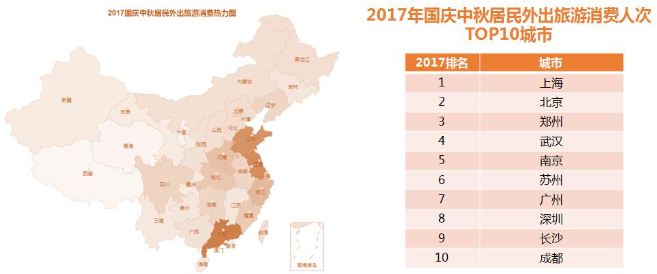 2017年國慶中秋居民外出旅游消費人次TOP10城市:上海、北京、鄭州、武漢、南京、蘇州、廣州、深圳、長沙、成都。