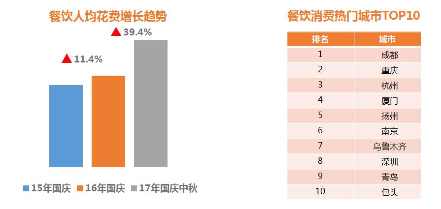 餐飲消費熱門城市TOP10:成都、重慶、杭州、廈門、揚州、南京、烏魯木齊、深圳、青島、包頭。
