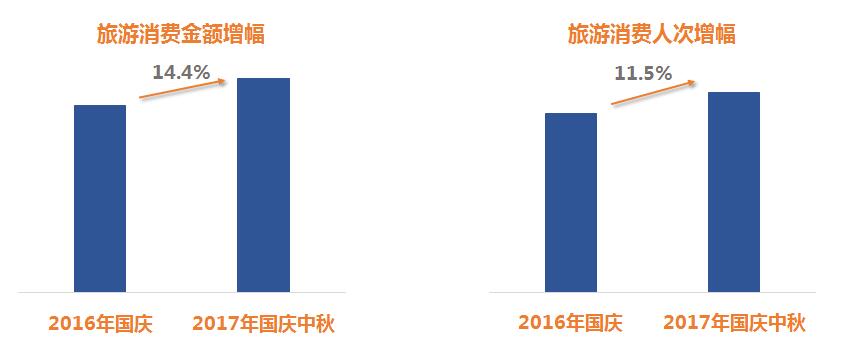 2017年國慶、中秋佳節(jié)雙節(jié)喜相逢,假期疊加形成8天“超級黃金周”,居民出游意愿較高,旅游需求旺盛,旅游消費金額及人次同比增幅均在10%以上。