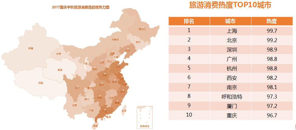 2017年國慶中秋假日旅游消費熱門目的地輻射范圍較廣,華東、華中、華南、東北地區(qū)旅游消費熱度均較高,其中熱度TOP10城市均為知名旅游城市。